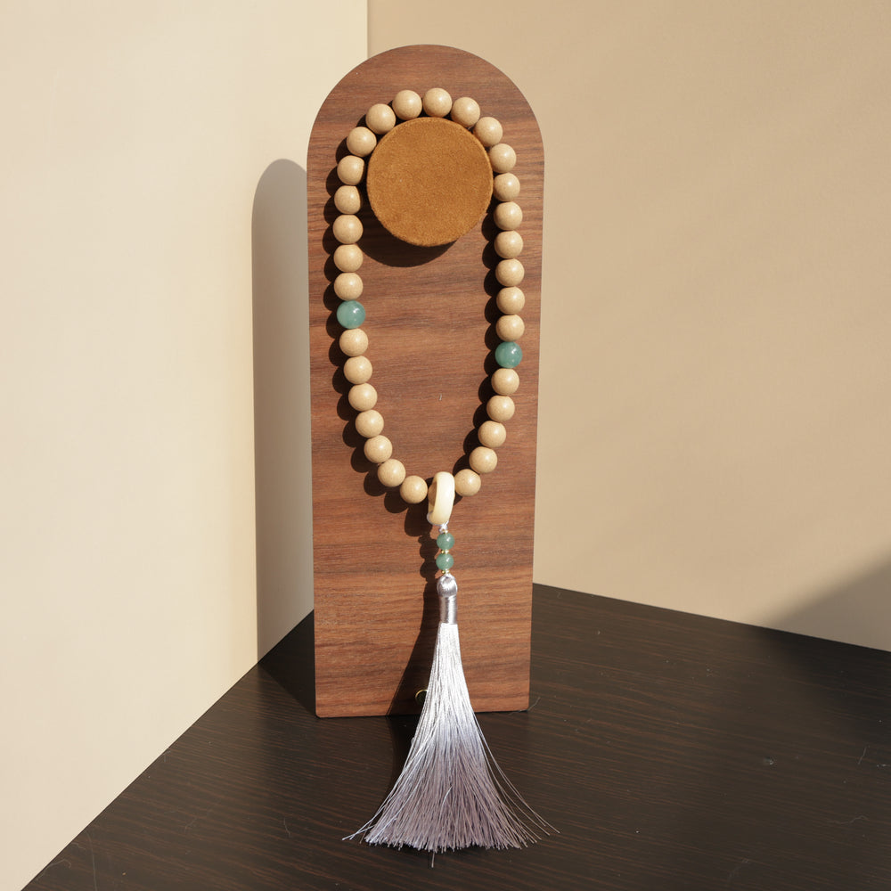 Material: Aromatic Wood Beads, Jade-like beads, Silver Tassel.